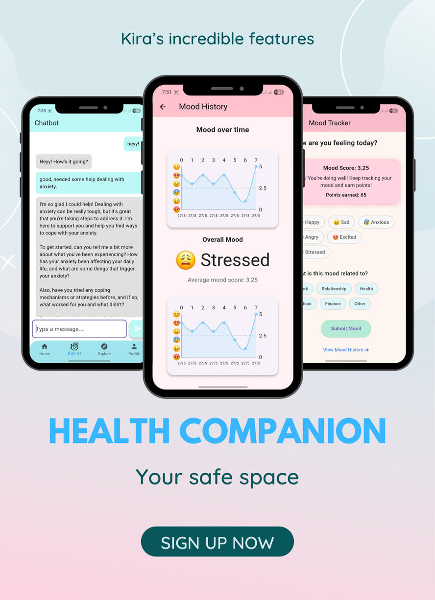 KIRA is a fully-coded Flutter mobile app with Supabase backend, live AI chatbot, mood tracker, journaling & more.